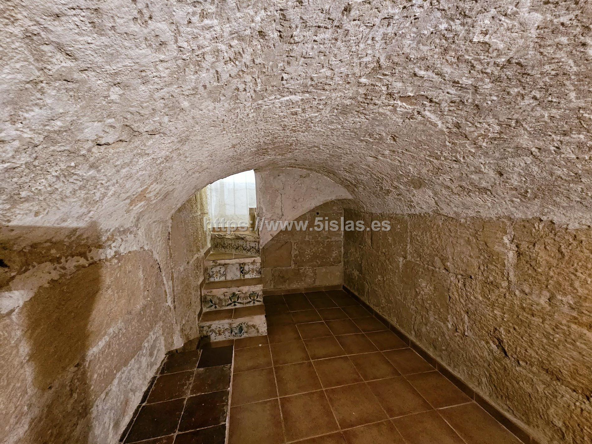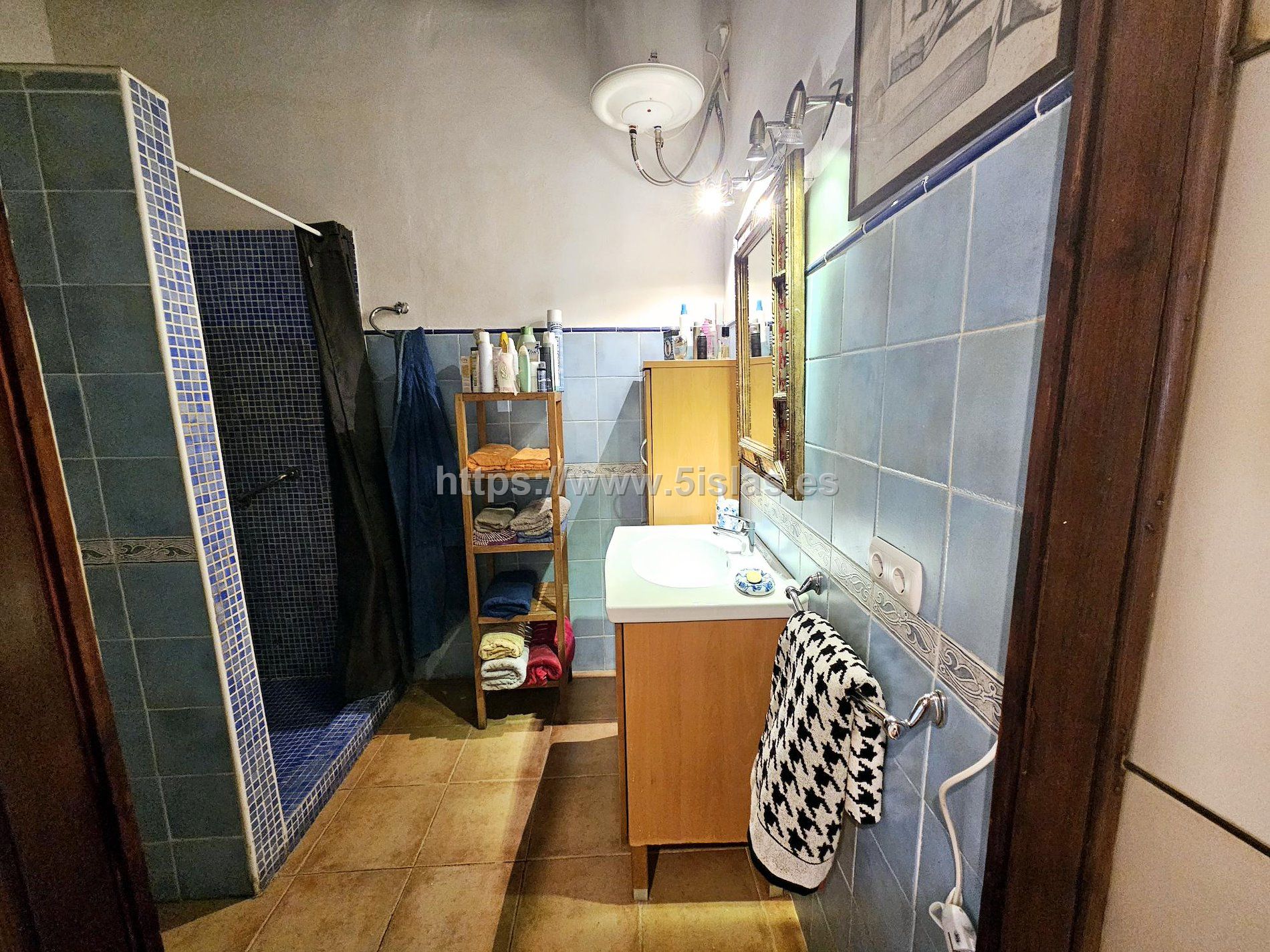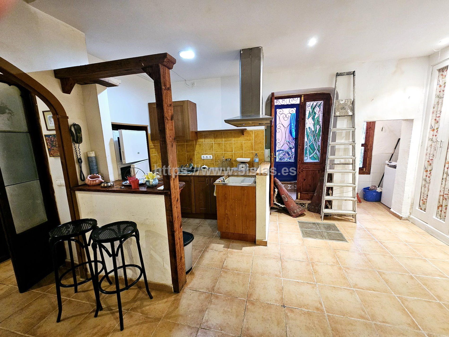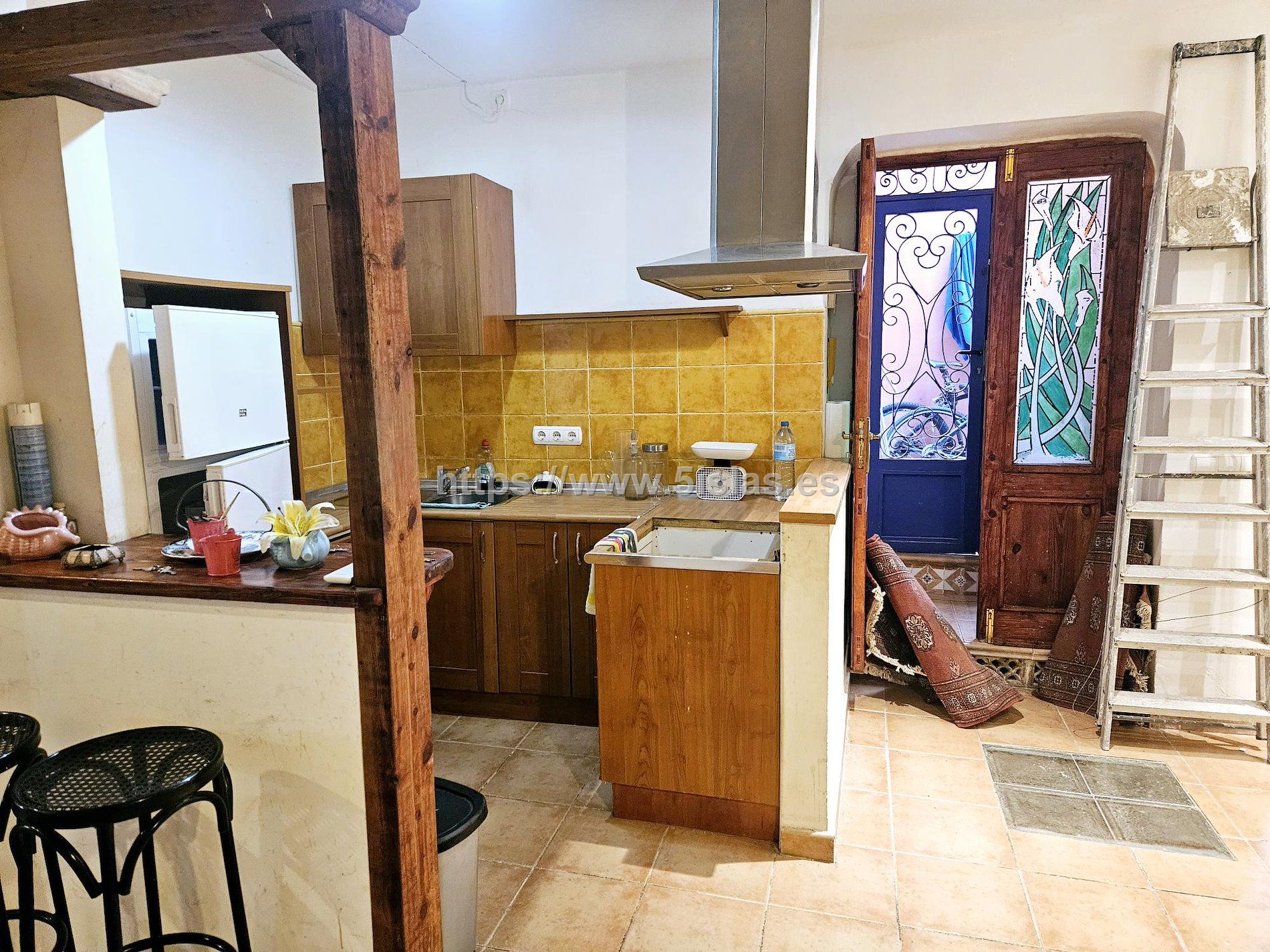 A continuación por un pasillo hay un amplio baño con plato de ducha y otro salón-comedor con cocina abierta con despensa y una pequeña coladuría con salida a una patio que da a la calle de detrás de la vivienda, debajo de esta estancia bajamos por unas escaleras y encontramos una original bodega o celler de 8m2 con claraboya.