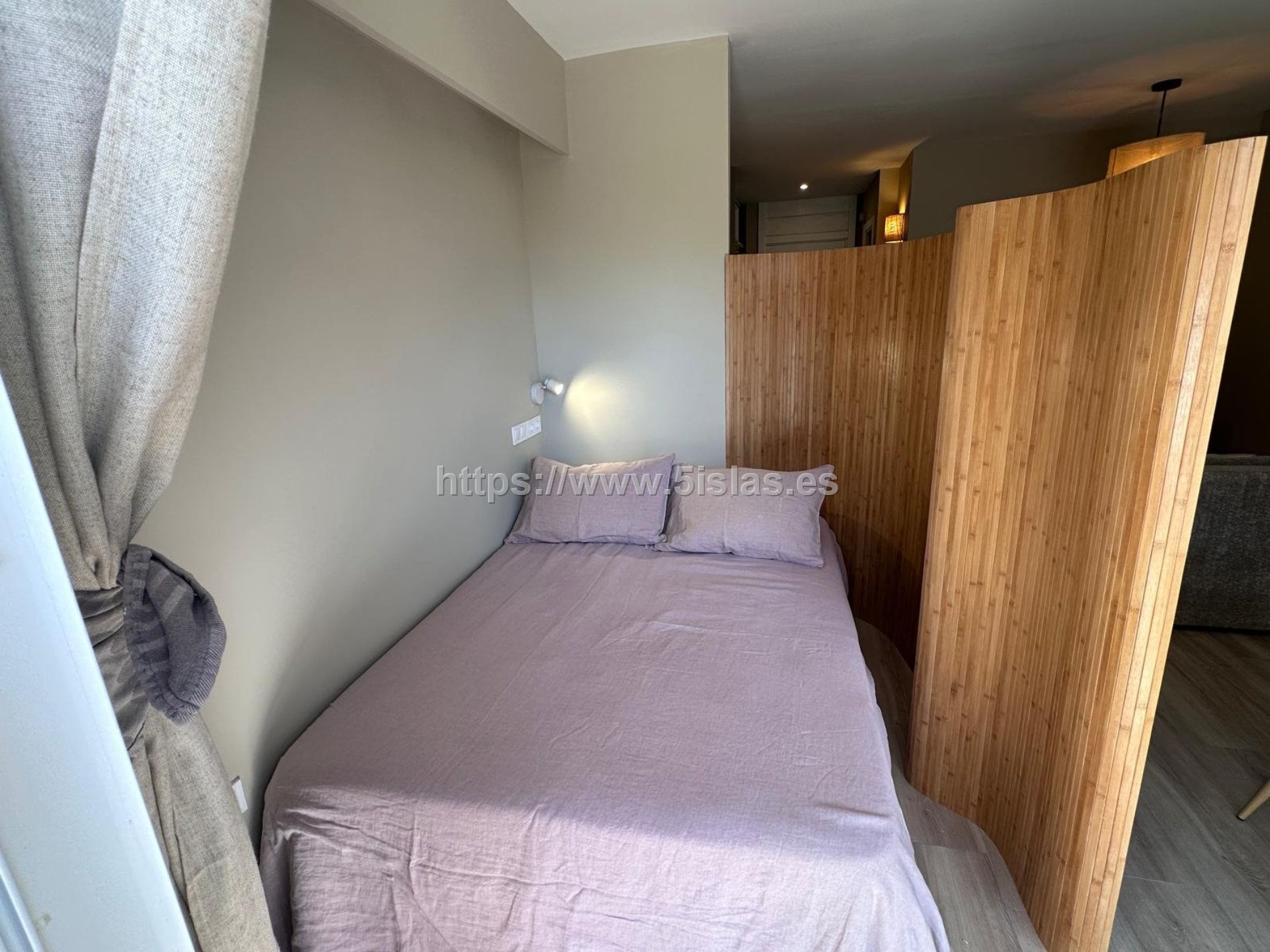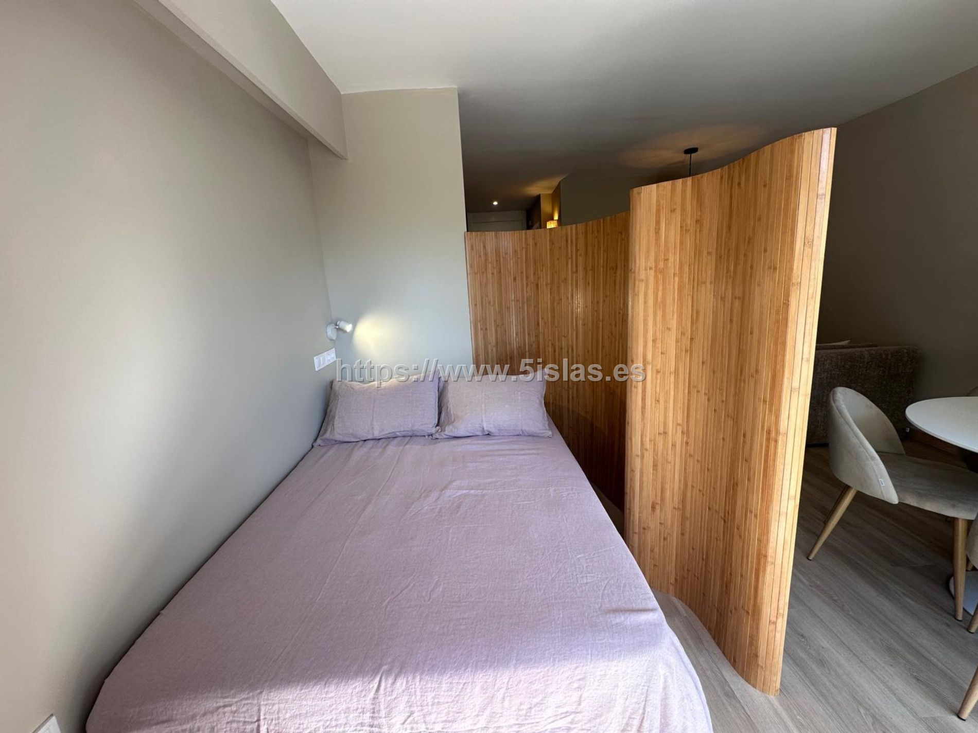 La habitación, separada del resto del estudio por un moderno biombo, ofrece un espacio íntimo y reservado. En la entrada un armario empotrado que proporciona una solución de almacenamiento haciendo que el espacio no sólo sea cómodo sino también funcional.